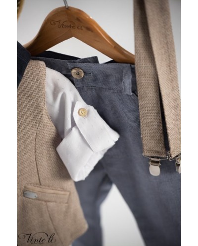 Trois-pièces με μπεζ γιλέκο, λευκό βαμβακερό πουκάμισο και σιέλ παντελόνι. Συνοδεύεται από ριγέ φουλάρι σε μπλε απόχρωση, τιράντες στο ύφασμα του γιλέκου και ψάθινο καβουράκι. Σετ 6 τεμαχίων.