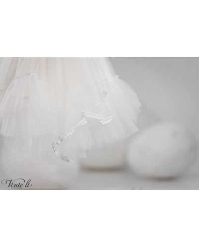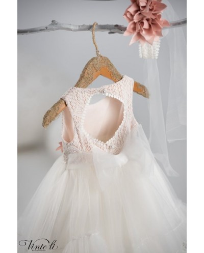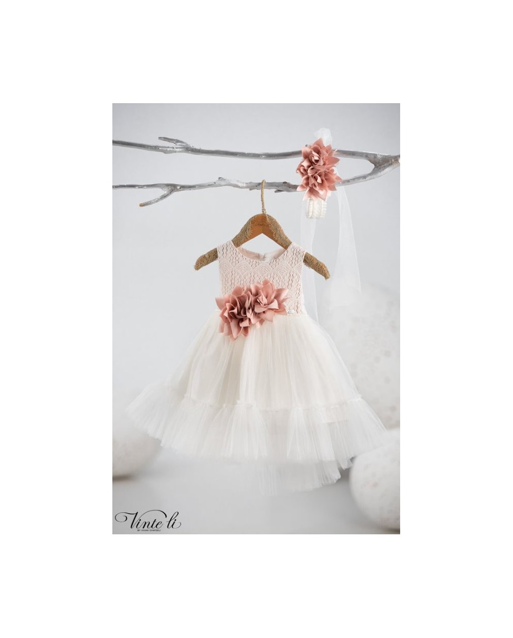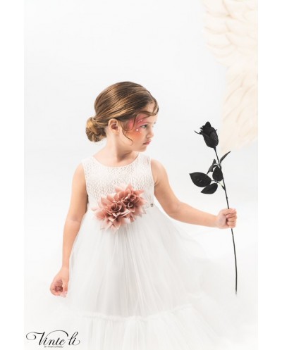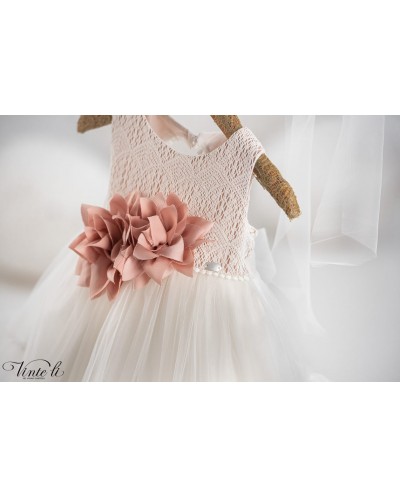 Φόρεμα μεσάτο ασύμμετρο με βαμβακερή δαντέλα στο μπούστο και οβάλ άνοιγμα στην πλάτη. Η φούστα του φορέματος είναι τούλινη με βολάν και δαντελένιο τρεσσάκι στο τελείωμα και διακοσμείται με τούλινο φιόγκο στο πίσω μέρος. Το ντεκόρ του φορέματος αποτελείται από χειροποίητα λουλούδια σε απόχρωση σάπιο μήλο. Συνοδεύεται από δετή κορδέλα για τα μαλλιά με το ντεκόρ του φορέματος. Σετ 2 τεμαχίων.