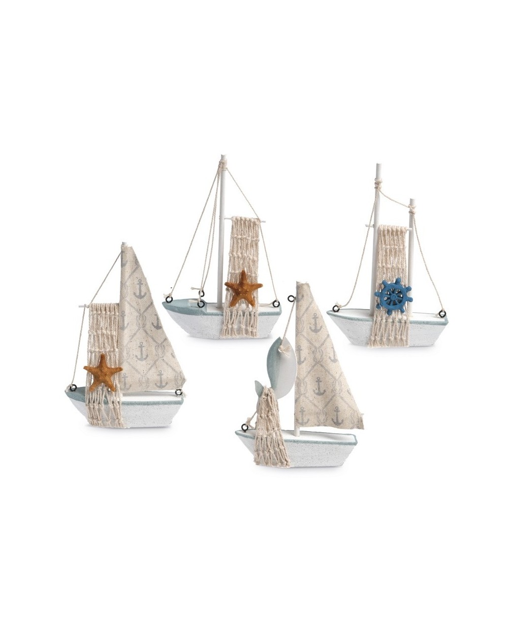 Ναυτικά διακοσμητικά καραβάκια. Η βάση τους είναι πολυεστερική σε λευκή απόχρωση και τα κατάρτια ξύλινα διακοσμημένα με δίχτυ και πανί.