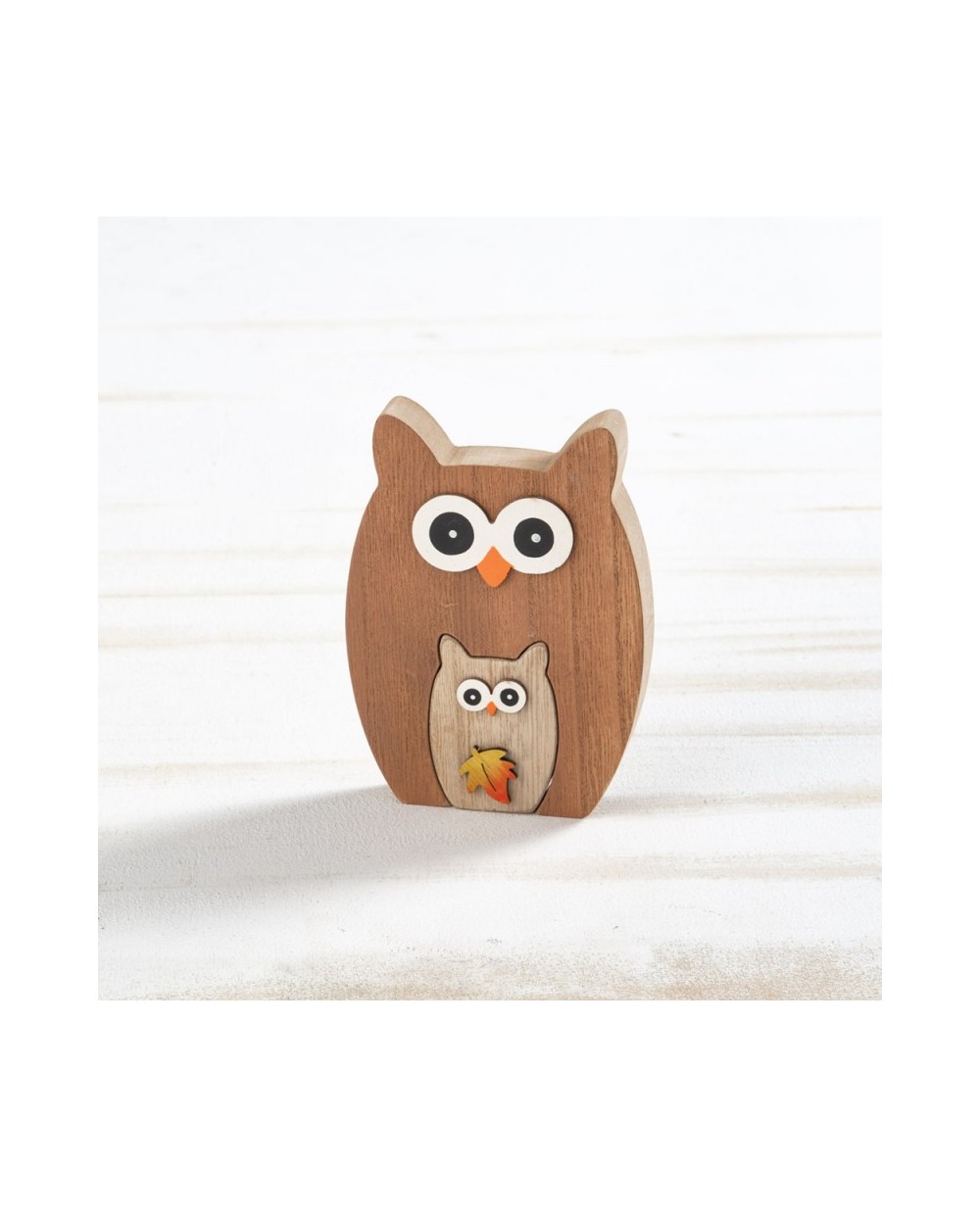Ξύλινη διακοσμητική διπλή κουκουβάγια σε καφέ και natural χρώμα. Η μικρή κουκουβάγια στο κάτω μέρος είναι αποσπώμενη από την μεγάλη.