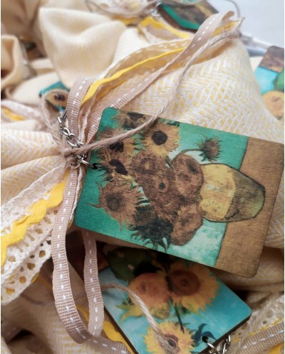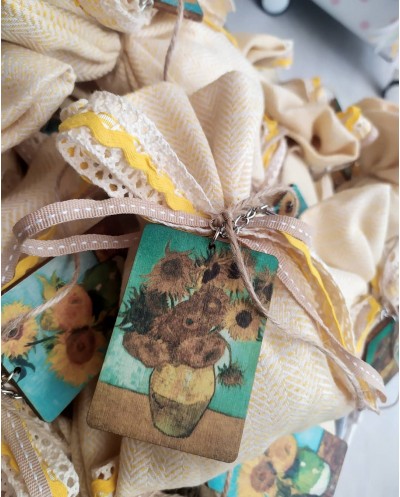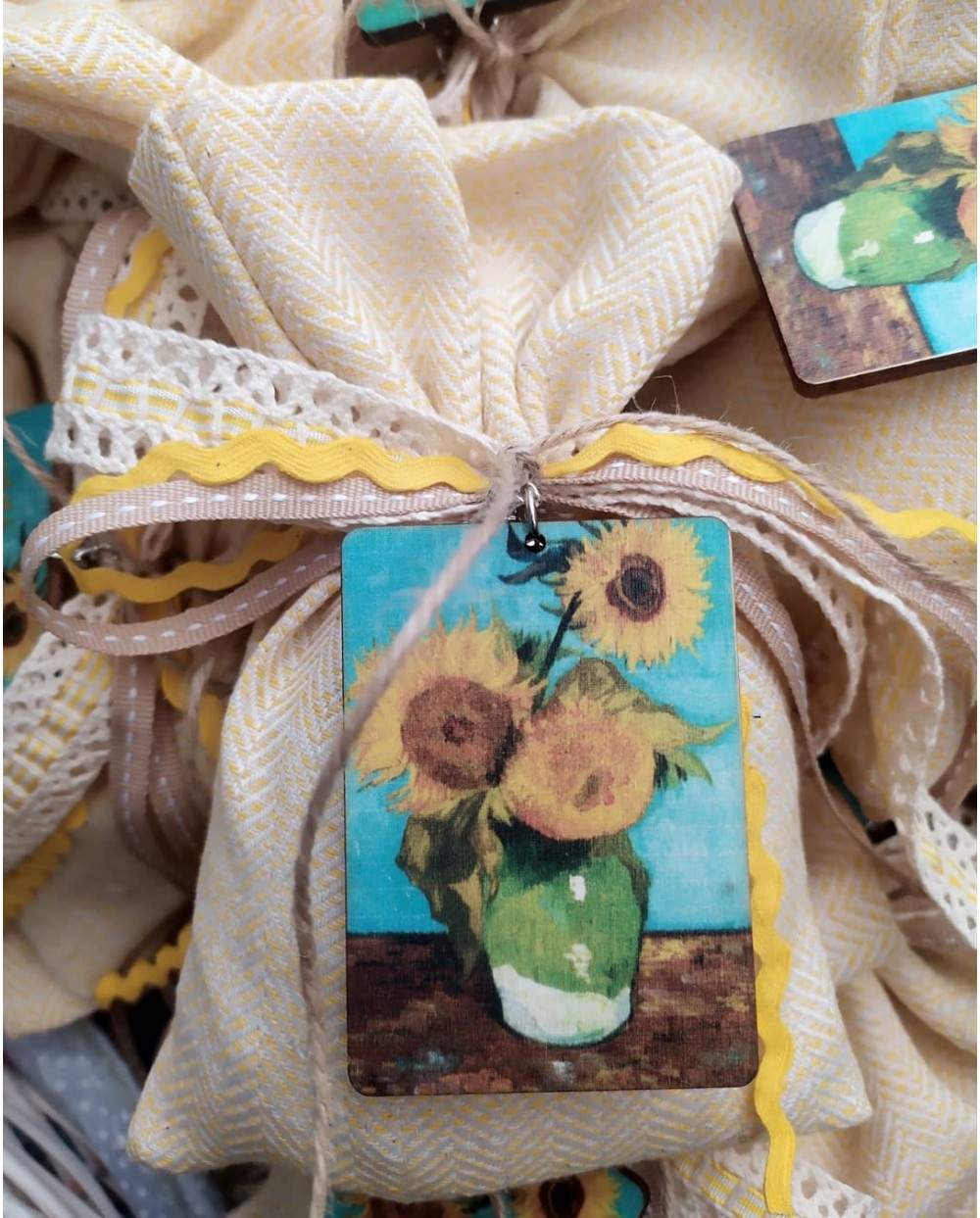 Μπομπονιέρα Βάπτισης Πουγκί Ξύλινα Μπρελόκ Ηλιοτρόπιο