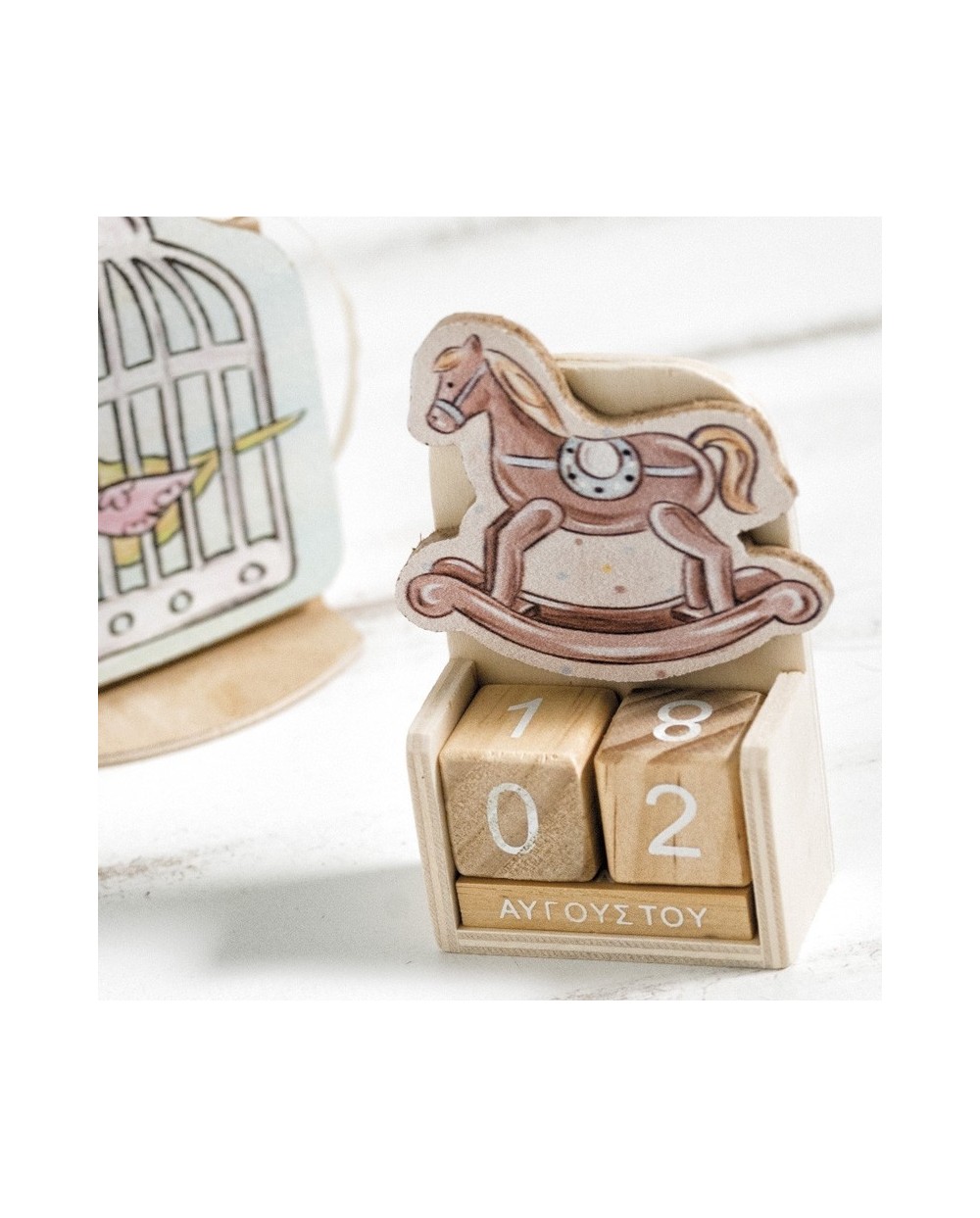 Ξύλινο ημερολόγιο με κύβους σε natural χρώμα. Διακοσμημένο με κοπτικό. Η παράσταση είναι αλογάκι.