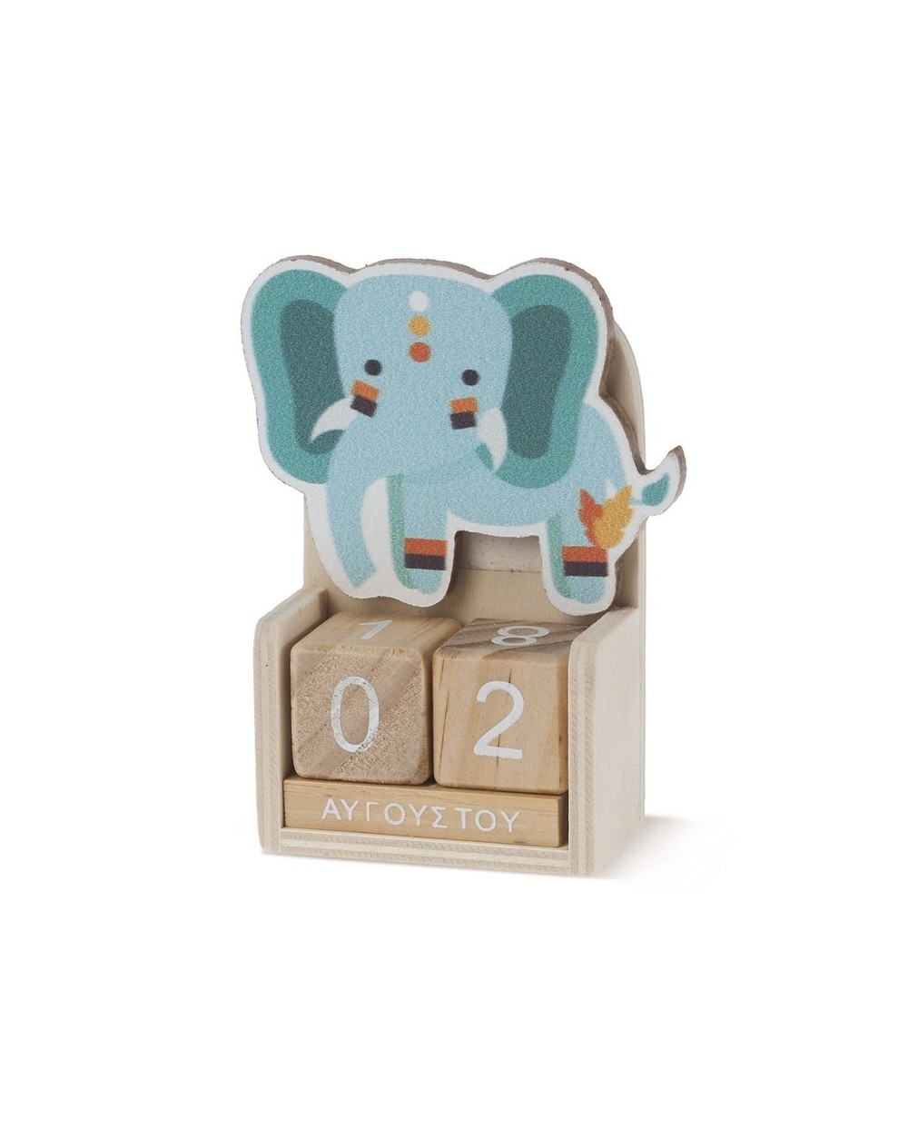 Ξύλινο ημερολόγιο με κύβους σε natural χρώμα. Διακοσμημένο με κοπτικό. Η παράσταση είναι ελέφαντας σε ethnic αποχρώσεις.