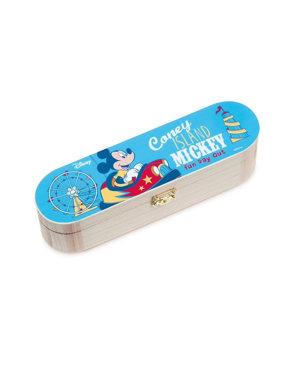 Disney ξύλινη natural κασετίνα με μεταλλικό κούμπωμα. Είναι διακοσμημένη με αυτοκόλλητο print Mickey Fun Day σε τιρκουάζ - κόκκινες αποχρώσεις.