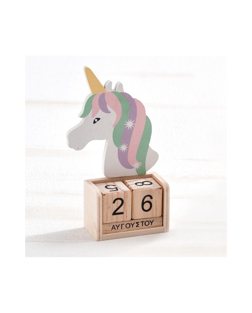 Ξύλινο natural ημερολόγιο με κύβους με σχέδιο μονόκερο σε λευκή απόχρωση με πολύχρωμη χαίτη.