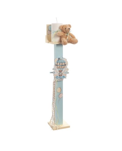 Ξύλινος κηροστάτης κρεμάστρα σε σιέλ και κίτρινο χρώμα. Είναι διακοσμημένος με ξύλινο κοπτικό αερόστατο και λούτρινο αρκουδάκι. Στην τιμή περιλαμβάνεται και το κερί για την εκκλησία.