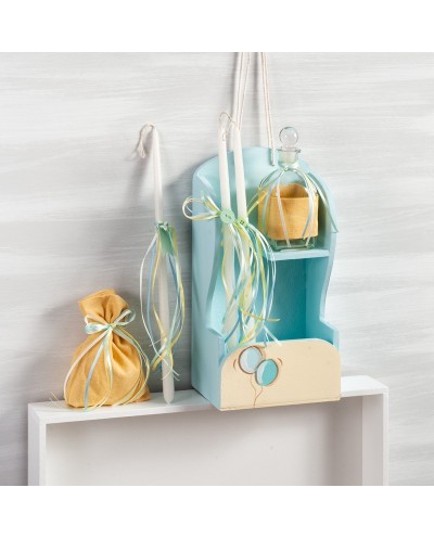 Ξύλινο ράφι λαδικών σε σιέλ-κίτρινο χρώμα και ζωγραφισμένο με μπαλόνια. Ο κωδικός περιλαμβάνει στολισμένα 3 κεράκια, σαπούνι μέσα σε πουγκί και μπουκαλάκι λαδιού.