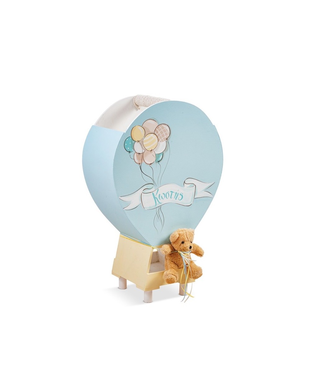 Ξύλινο κουτί βαπτιστικών αερόστατο. Το κουτί είναι βαμμένο σε σιέλ και κίτρινο χρώμα. Στο επάνω μέρος είναι ζωγραφισμένο ένα μπουκέτο από μπαλόνια και μία κορδέλα με το όνομα του παιδιού. Το κάτω μέρος είναι διακοσμημένο με λούτρινο αρκουδάκι.