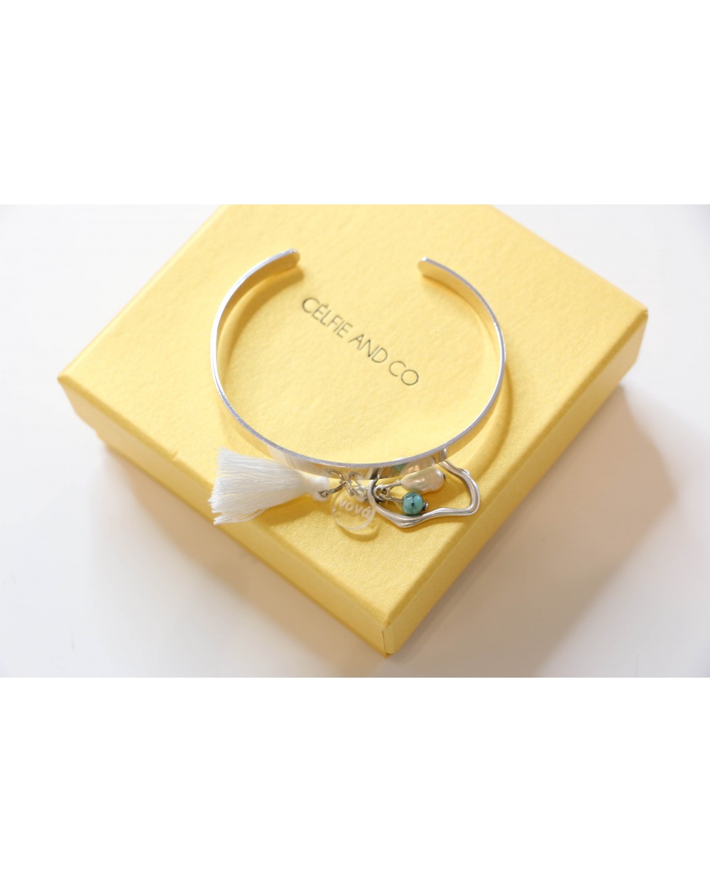 Ασημένιο βραχιόλι σε μορφή bracelet με κρεμαστό φουντάκι σε λευκό χρωματισμό, λευκό πέτρωμα, βεραμάν χαολίτη καθώς και διαφανή κυκλική πλακέτα με ελληνική γραφή της επιλογής σας(μαμά ή νονά).