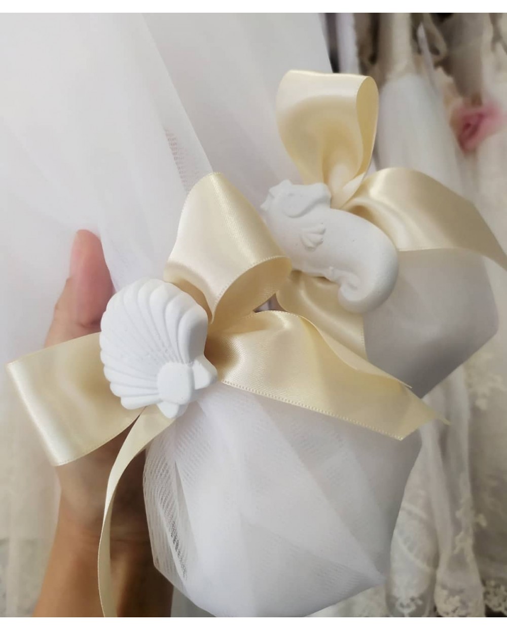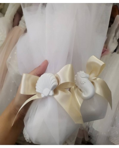 Μπομπονιέρα Γάμου Τούλι με σατέν φιόγκο και Γύψινα Θαλασσινά Διακοσμητικά