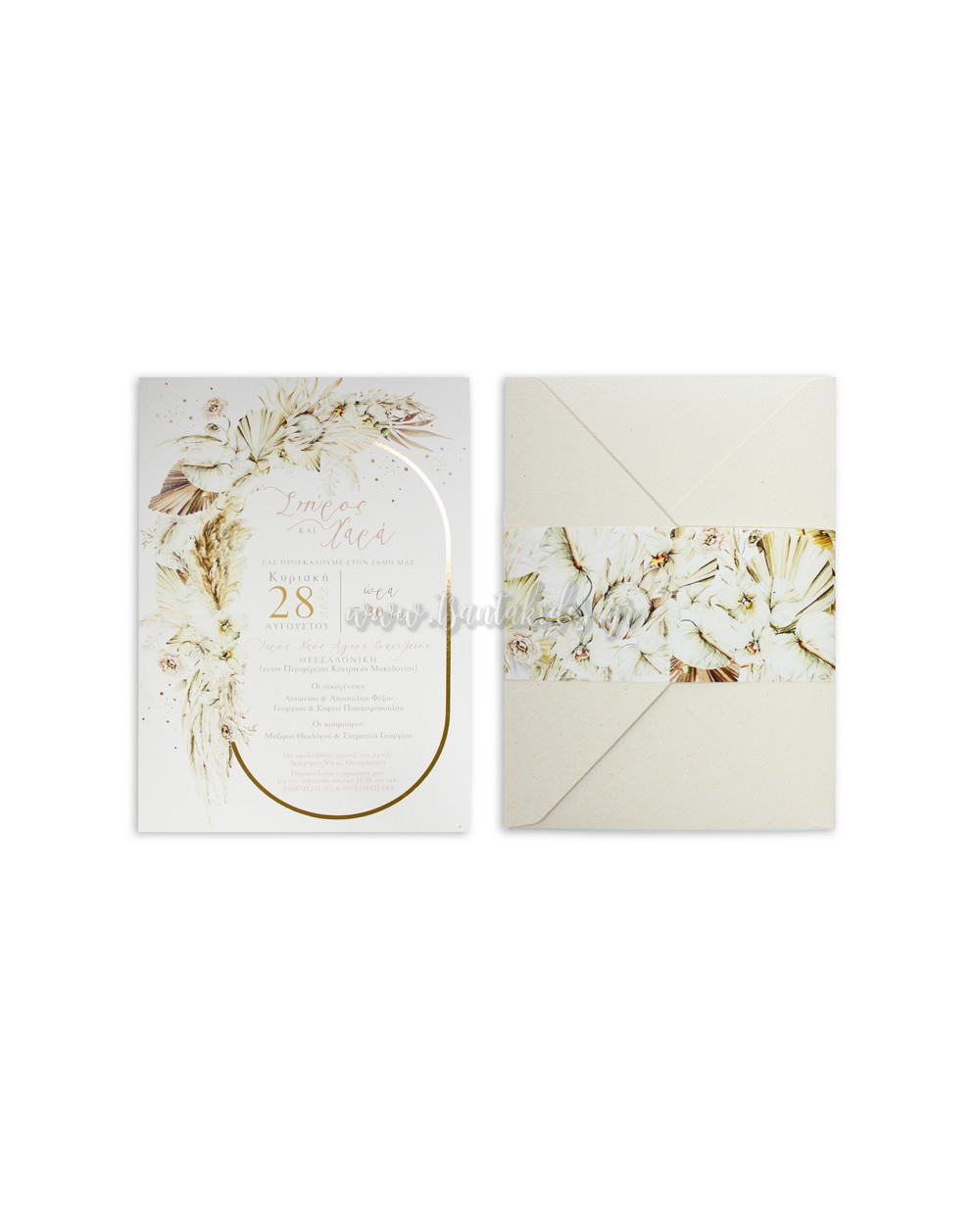 Προσκλητήριο γάμου με floral σχεδιασμό και χρυσό οβάλ στεφάνι .