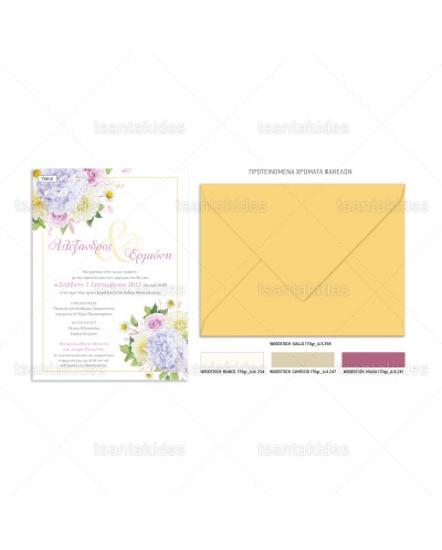 Προσκλητήριο γάμου με floral ρομαντικές συνθέσεις με ορτανσίες και χαμομήλι.
