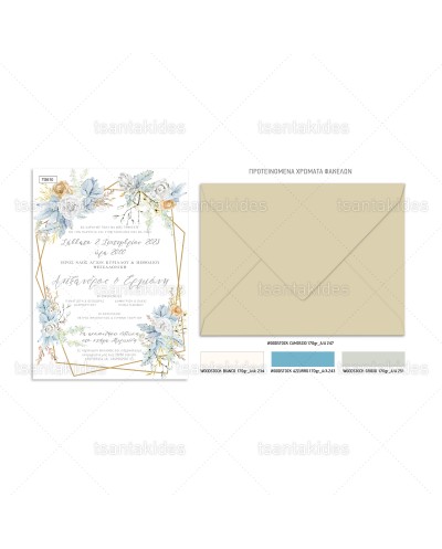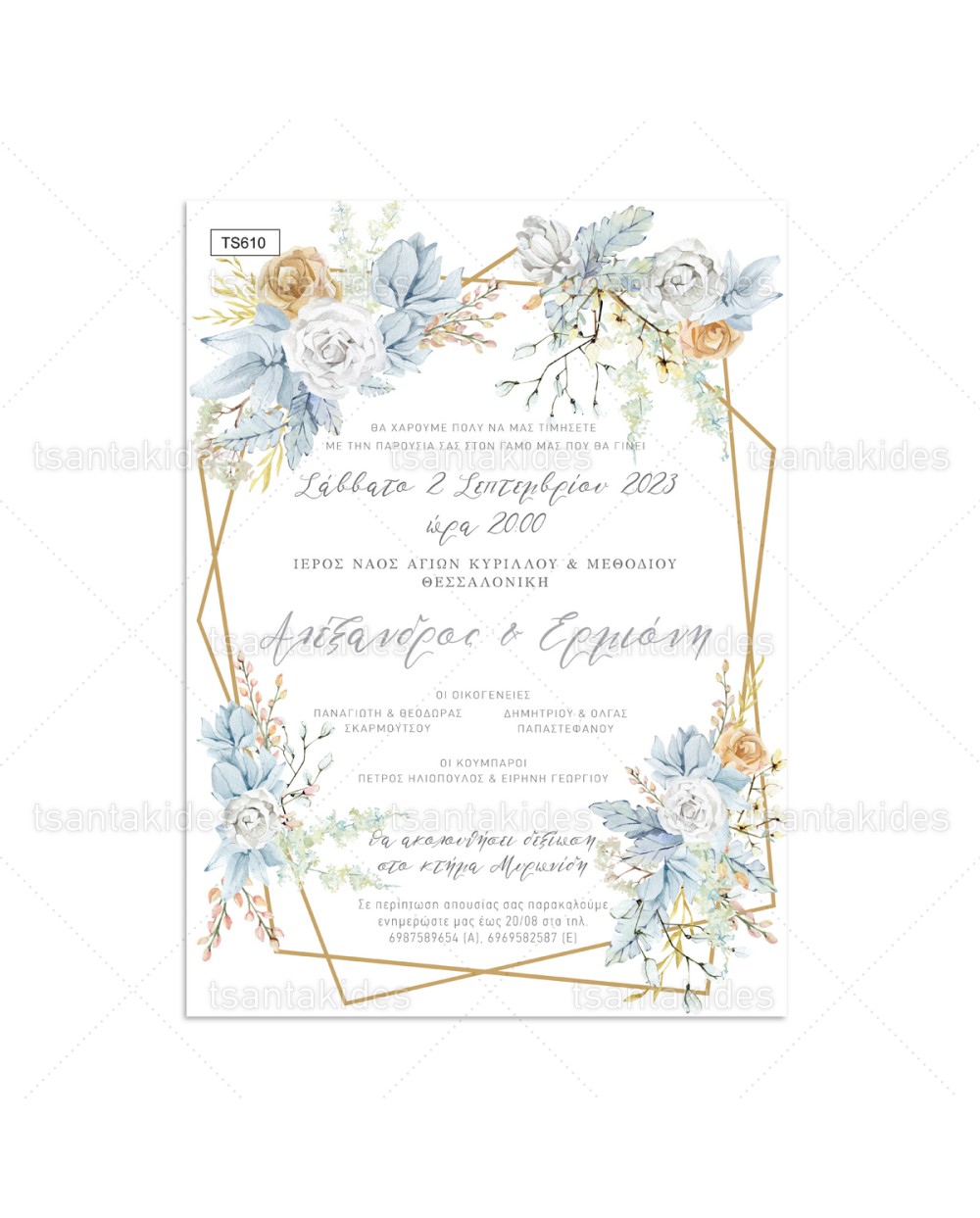 Προσκλητήριο γάμου με dusty blue λουλούδια και χρυσό γεωμετρικό σχήμα.