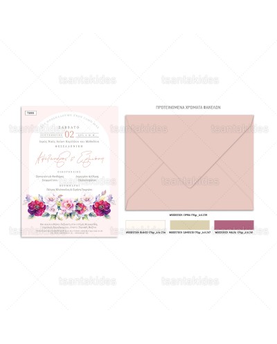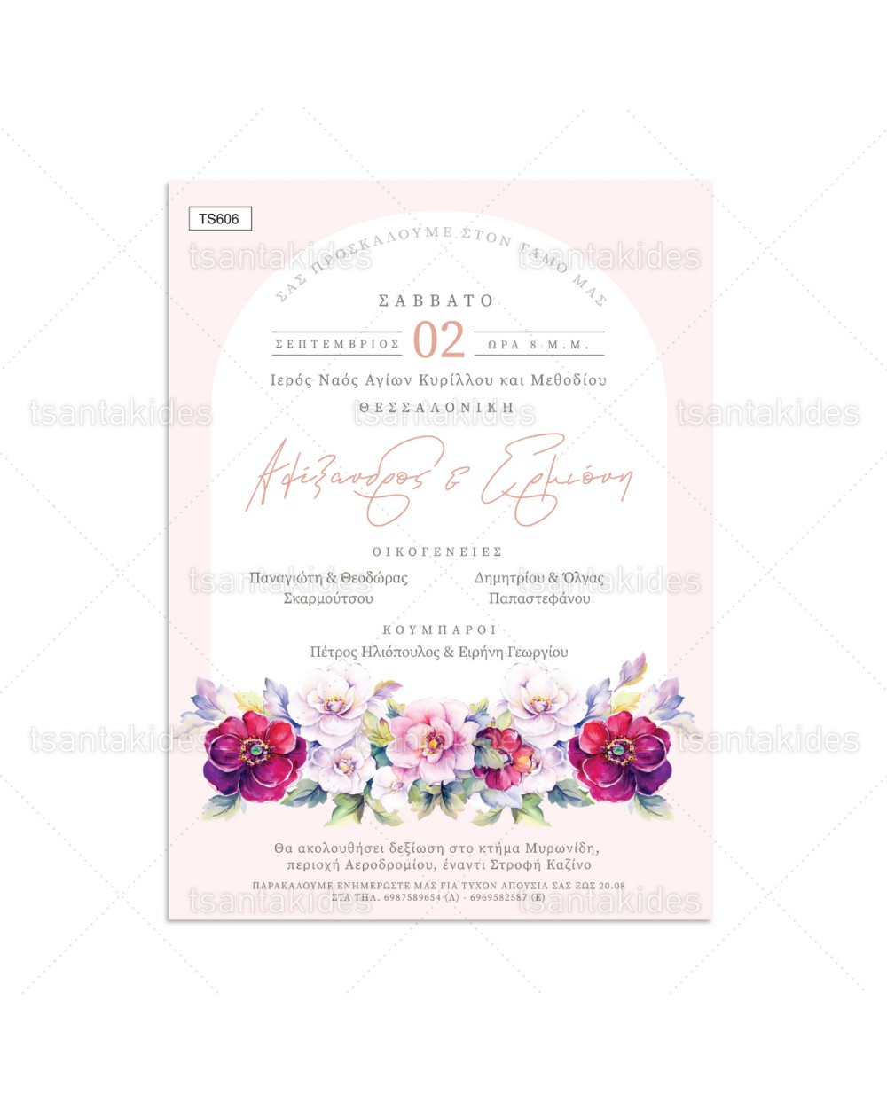Προσκλητήριο γάμου με floral διάκοσμο σε αψίδα.