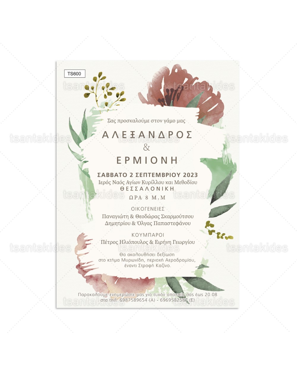Προσκλητήριο γάμου με floral σύνθεση σε γήινες αποχρώσεις.