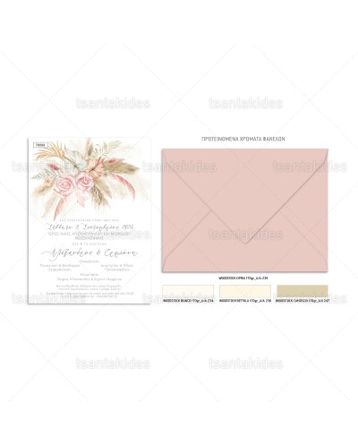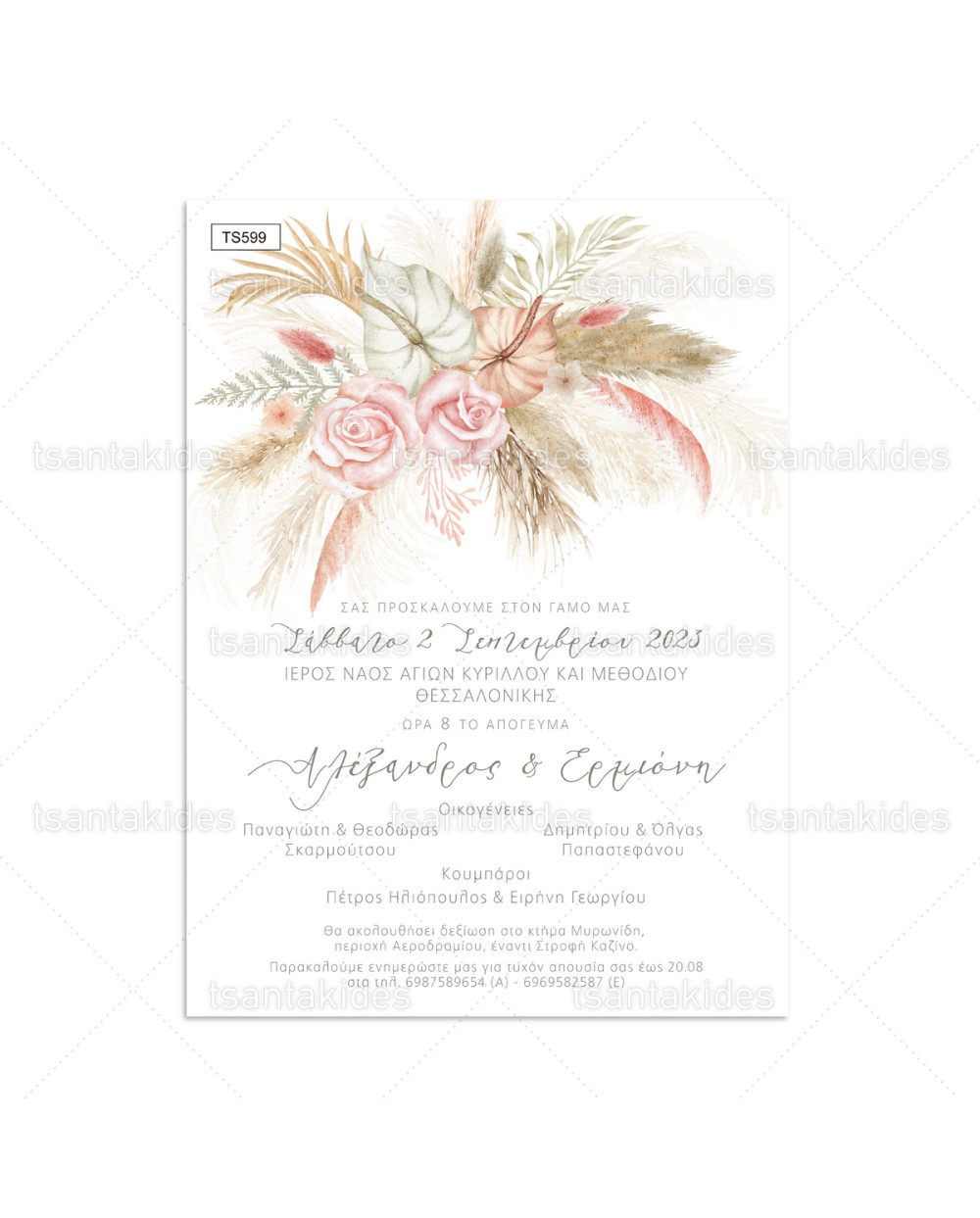 Προσκλητήριο γάμου με bohemian ύφος και pampas λουλούδια.