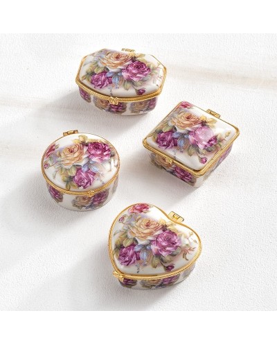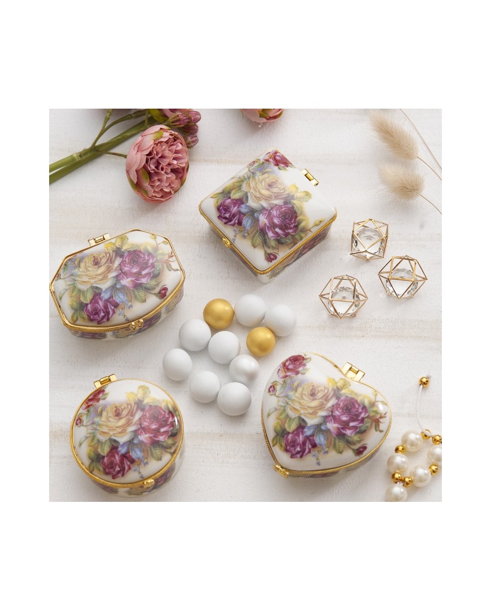 Μπιζουτιέρα από πορσελάνη διακοσμημένη με λουλούδια και με κούμπωμα σε χρυσό χρώμα, κατάλληλη και για γάμο. Η συσκευασία περιλαμβάνει 4 διαφορετικά σχήματα μπιζουτιέρας, στρογγυλό, καρδιά, τετράγωνη και ορθογώνια.