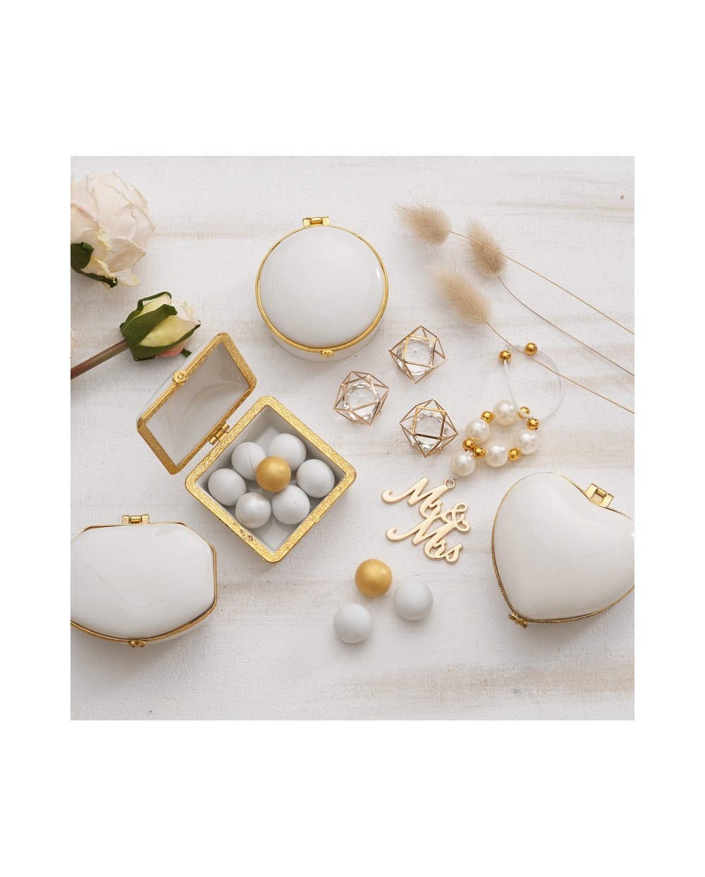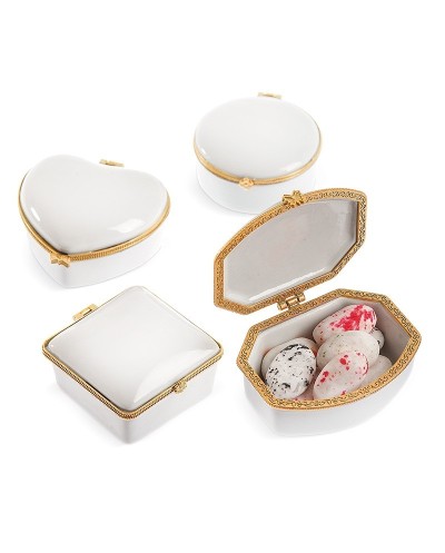 Μπιζουτιέρα λευκή από πορσελάνη με κούμπωμα σε χρυσό χρώμα. Η συσκευασία περιλαμβάνει 4 διαφορετικά σχήματα μπιζουτιέρας, στρογγυλό, καρδιά, τετράγωνη και ορθογώνια.