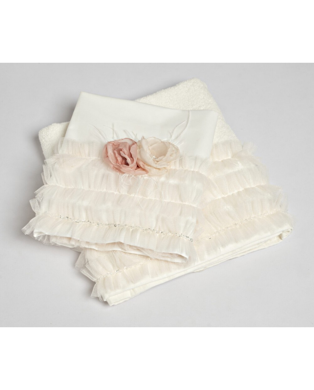 Εντυπωσιακά βαμβακερά λαδόπανα σε ιβουάρ χρώμα με πλούσιο βολάν σε χρώμα πούδρα που το στολίζει χειροποίητο λουλούδι και πούπουλα maraboo στις ίδιες αποχρώσεις.