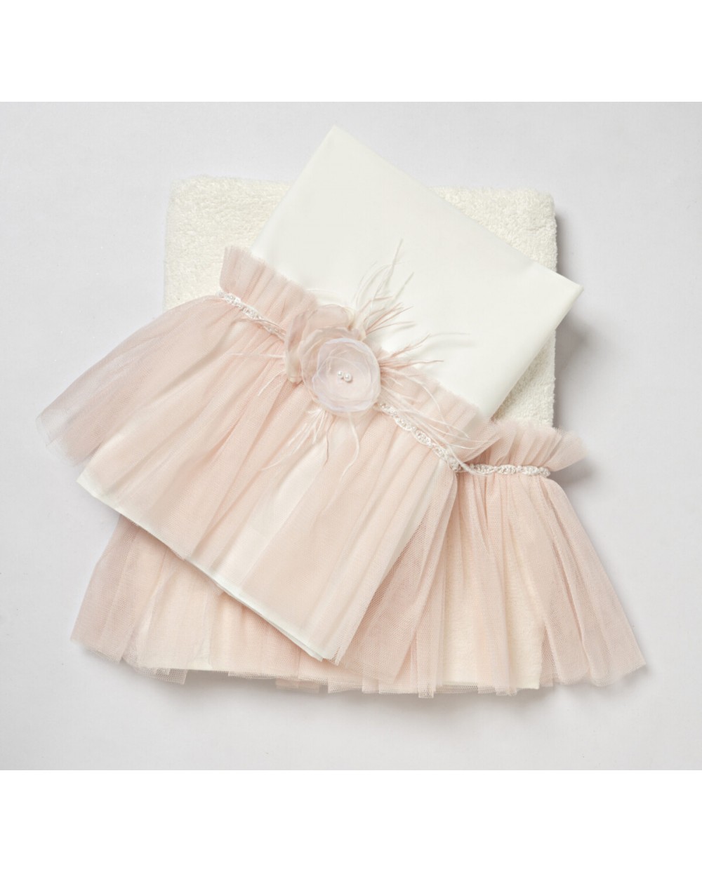 Ρομαντικά βαμβακερά λαδόπανα σε ιβουάρ χρώμα με βολάν σε ροζ παστέλ αποχρώσεις που το στολίζουν, χειροποίητη σύνθεση λουλουδιών, πούπουλα maraboo και τρέσα με διάφανα κρυσταλλάκια .