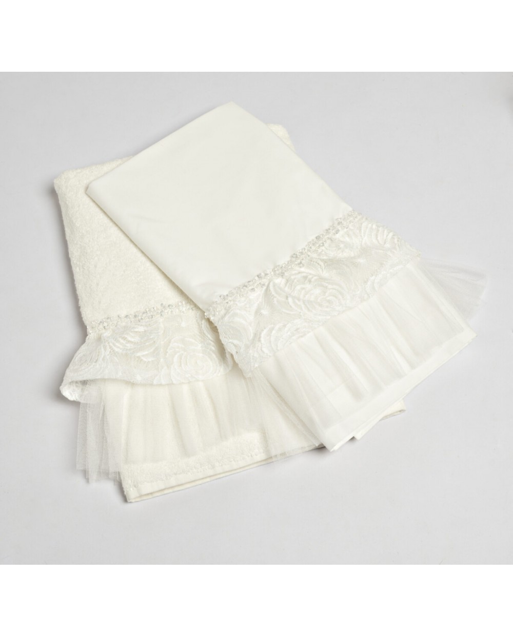Ιδιαίτερα βαμβακερά λαδόπανα σε ιβουάρ χρώμα με διπλό βολάν από τούλι και δαντέλα σε off white απόχρωση, στολισμένο με ιδιαίτερη τρέσα με διάφανα κρυσταλλάκια.