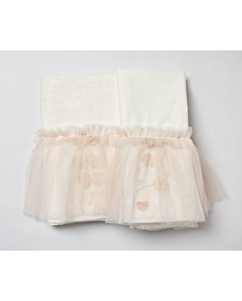 Ρομαντικά βαμβακερά λαδόπανα σε ιβουάρ χρώμα με βολάν σε ροζ παστέλ αποχρώσεις που το στολίζουν, δαντέλα με 3D λουλούδια και τούλι με λάμψη.
