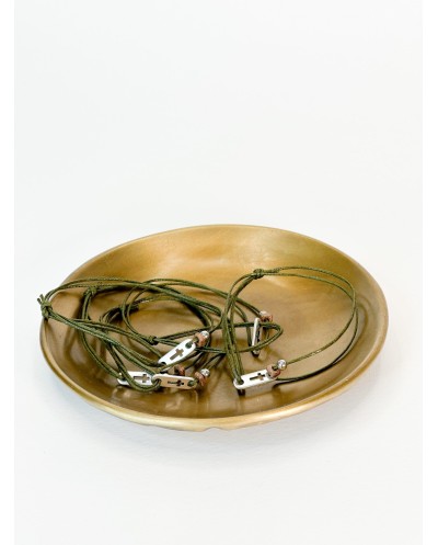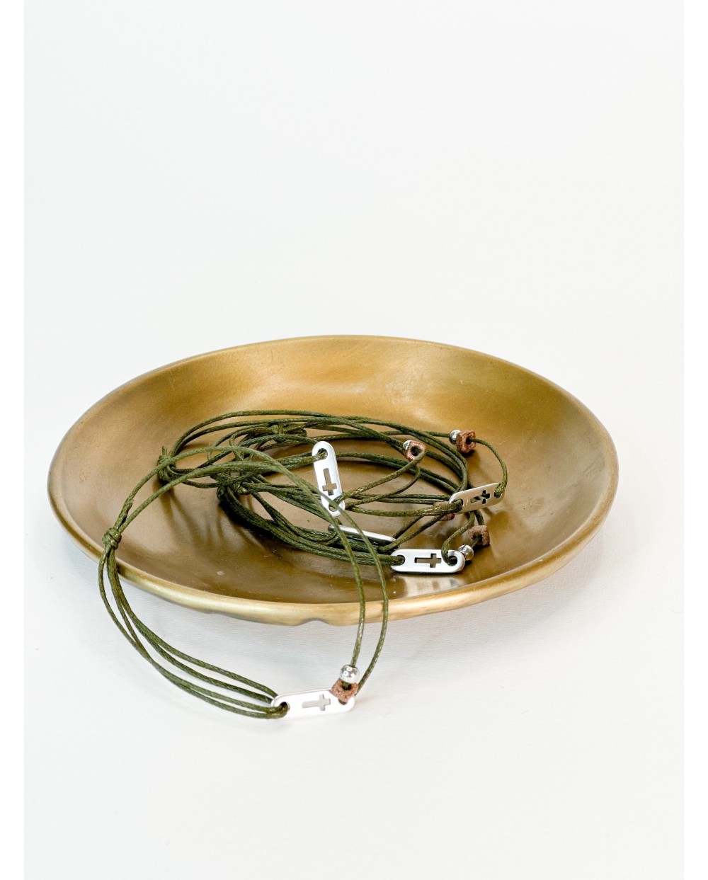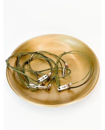 Μαρτυρικό βραχιόλι με λαδί κορδόνι, καφέ ροδέλα σταυρό και χάντρα σε ασημί απόχρωση. Οι φωτογραφίες έχουν υποστεί επεξεργασία, ίσως να διαφέρουν λίγο τα χρώματα στην πραγματικότητα.