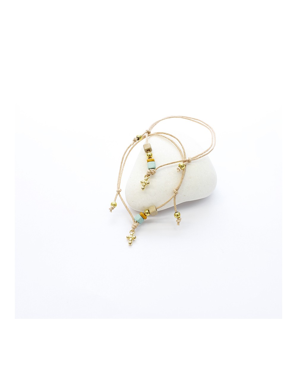 Μαρτυρικό βραχιόλι με μπεζ σουέτ, μοτίφ επιχρυσωμένο μάτι και σταυρό.