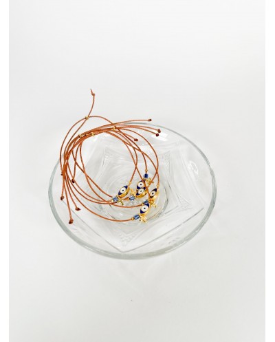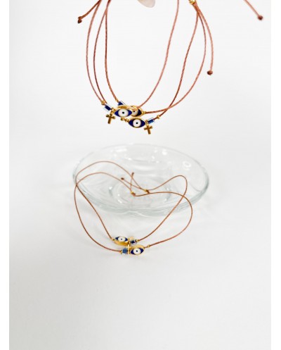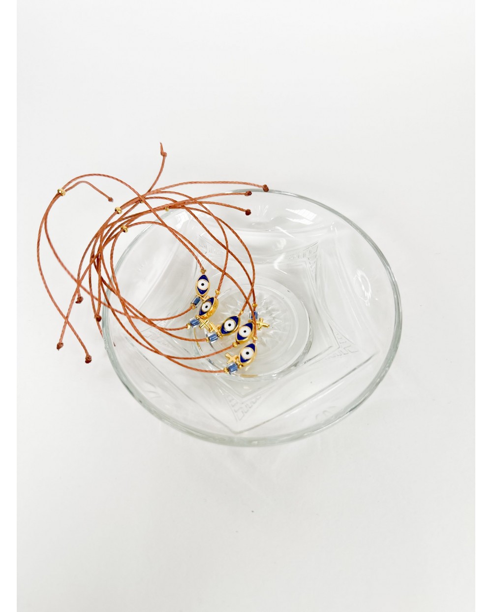 Μαρτυρικό βραχιόλι με μοτίφ μπλε μάτι, μπλε χάντρα και επιχρυσωμένο σταυρό.