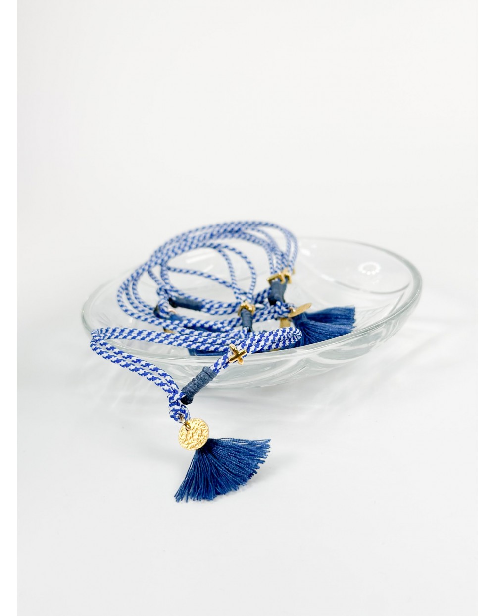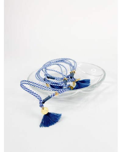 Μαρτυρικό βραχιόλι με δίχρωμο μπλε άσπρο κορδόνι, μπλε φούντα, επιχρυσωμένο σταυρό και φλουρί.