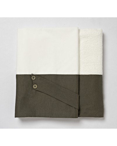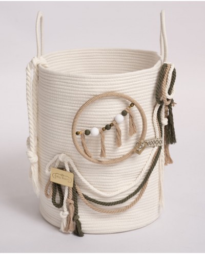 Ένα καινούργιο υφασμάτινο μεγάλο καλάθι σε ιβουάρ απόχρωση στολισμένο με μπεζ και λαδί κορδόνια.