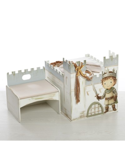 Ξύλινο Κουτί-Κάστρο: Χειροποίητη κατασκευή σε σχήμα κάστρου με πολεμίστρες, διακοσμημένο με την εικονογράφηση ενός γενναίου μικρού ιππότη με σπαθί. Περιλαμβάνει ξύλινο μονόγραμμα (π.χ. "K") στην πύλη και στολισμό με χοντρά σχοινιά σε γήινες αποχρώσεις. (Διαστάσεις: 35cm x 36cm x 42cm).