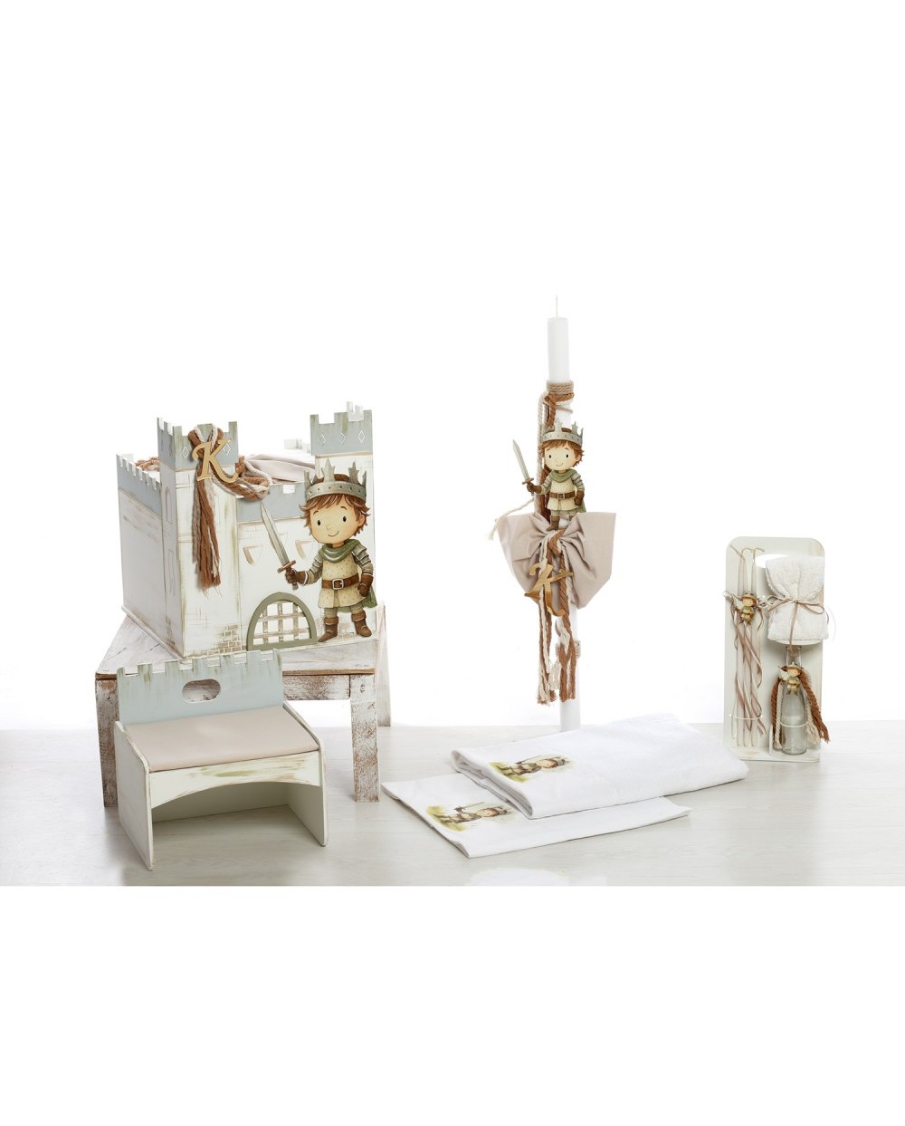 Ολοκληρωμένο premium πακέτο βάπτισης για αγόρι από τη συλλογή "Little Knight's Adventures". Μια παραμυθένια και διαδραστική πρόταση που μετατρέπει τη βάπτιση σε μια μεσαιωνική περιπέτεια, με κεντρικό στοιχείο ένα εντυπωσιακό ξύλινο κάστρο που λειτουργεί ως κουτί αποθήκευσης και παιχνίδι.