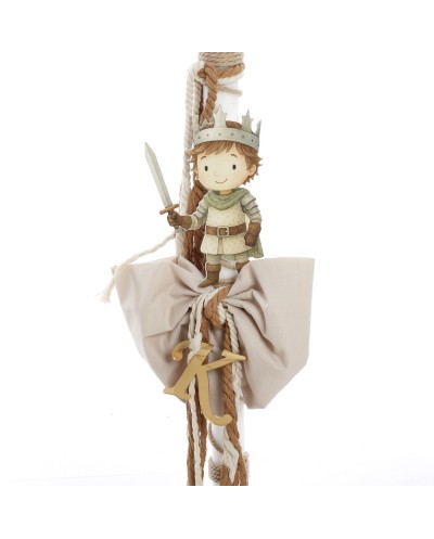 Λαμπάδα: Στολισμένη με μεγάλο υφασμάτινο φιόγκο, σχοινιά, το ξύλινο μονόγραμμα και ξύλινη φιγούρα του μικρού ιππότη.