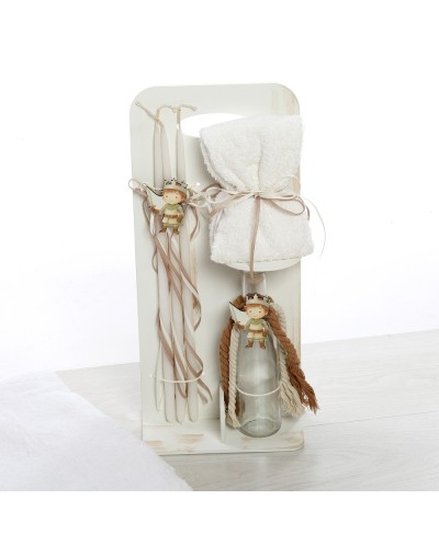 Σετ Λαδιού: Λευκό ξύλινο stand που περιλαμβάνει μπουκάλι λαδιού, σαπούνι και 3 κεράκια, όλα ασορτί διακοσμημένα με σχοινιά και μικρές φιγούρες ιπποτών.