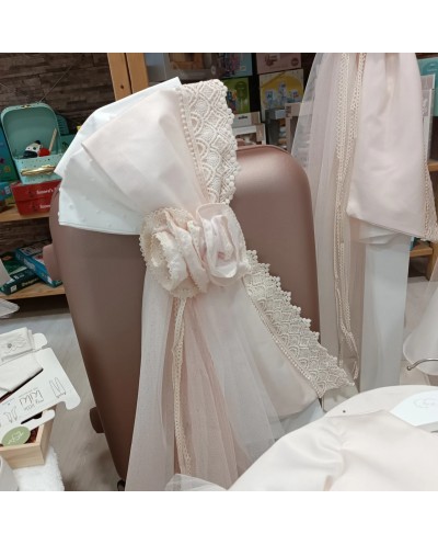 Βαλίτσα τρόλεϊ σάπιο μήλο, με πλούσιο στολισμό σε εκρού – σομόν απόχρωση με ιδιαίτερη ανάγλυφη δαντέλα, πλούσια τούλια και χειροποίητα λουλούδια