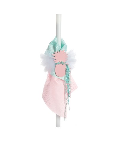 Λαμπάδα βάπτισης, δεμένη σε στυλ γραβάτας με ύφασμα γκρο βεραμάν και ροζ, print με μαργαρίτες, τούλι λευκό σαν pom pom και διακοσμημένη με ξύλινο ανανά ροζ και κορδόνι με pom pom σε απόχρωση βεραμάν-ροζ.