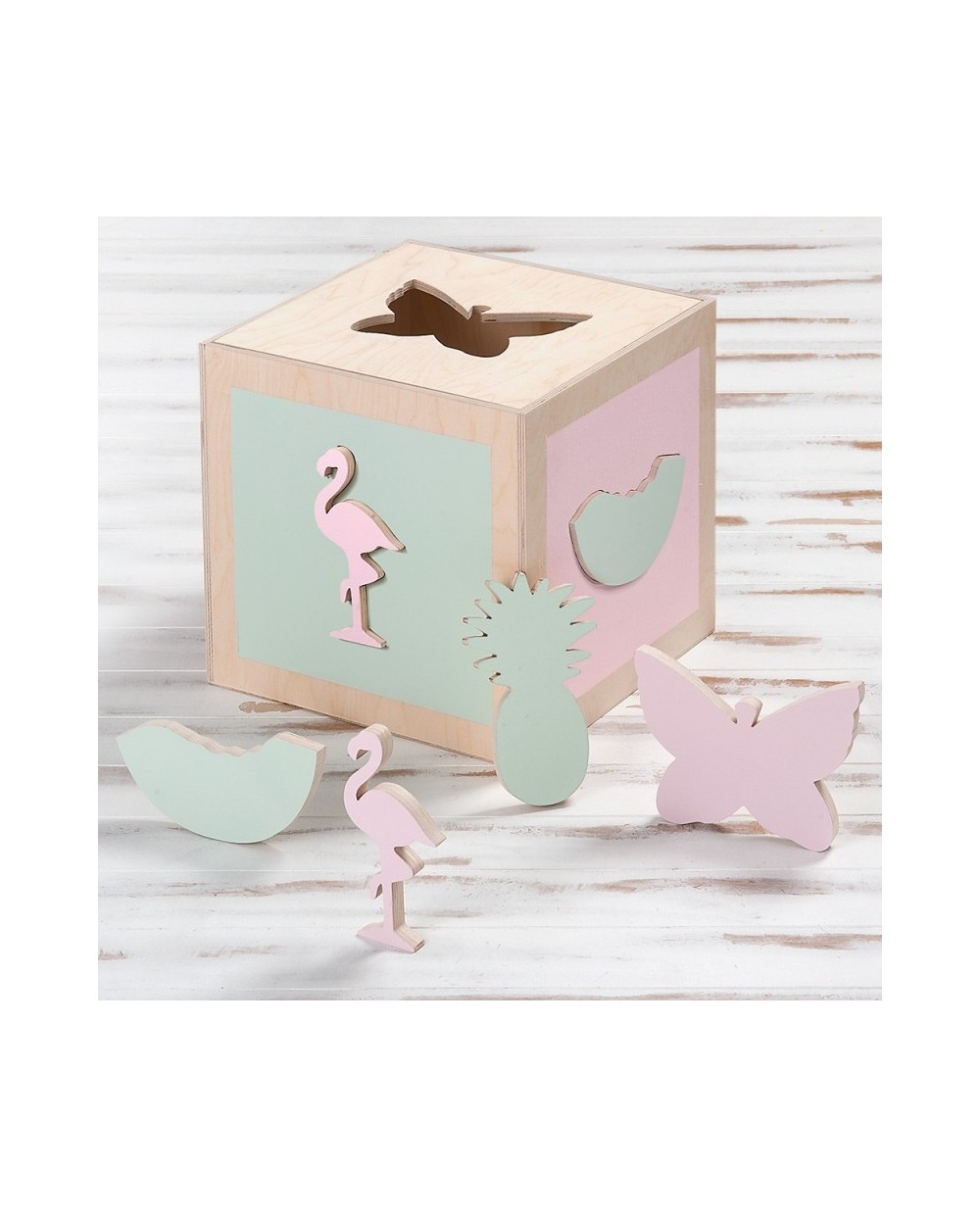 Ξύλινος natural κύβος, συσκευασία βάπτισης βαμμένος σε ροζ-βεραμάν αποχρώσεις και συνοδευόμενος από ξύλινα κοπτικά τροπικά (φλαμίνγκο, ανανάς, φέτα από καρπούζι, πεταλούδα). Το κουτί λειτουργεί και σαν παιχνιδόκουτο στο οποίο το παιδί προσπαθεί να ταιριάξει τα σωστά κοπτικά στα σωστά κενά κάθε πλευράς.