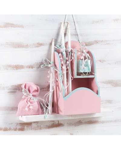 Ξύλινη κρεμαστή συσκευασία βαμμένη ροζ-βεραμάν που χρησιμεύει ως ράφι λαδικών. Ο κωδικός περιλαμβάνει τα 3 κεράκια, το σαπούνι μέσα σε πουγκάκι και το μπουκάλι του λαδιού, όλα στολισμένα σε ροζ-βεραμάν αποχρώσεις με κορδόνια pom pom.