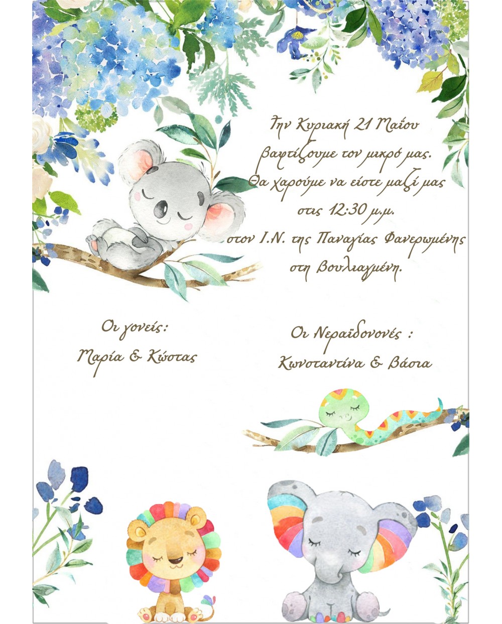 Προσκλητήριο Βάπτισης Ζωάκια Ζούγκλας σε δέντρα με Φάκελο