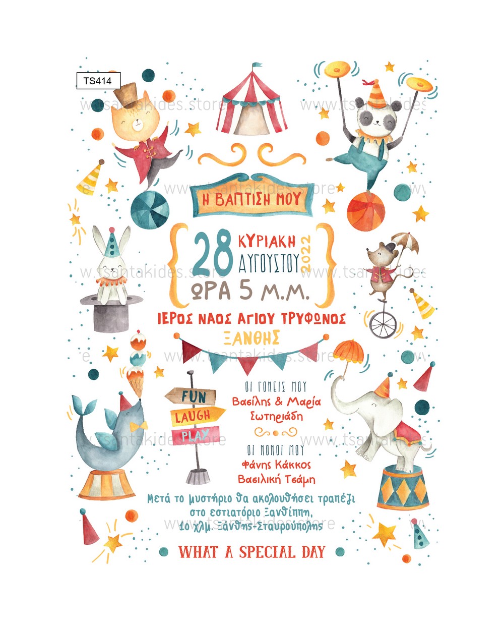 Προσκλητήριο βάπτισης για αγόρι με θέμα Circus.