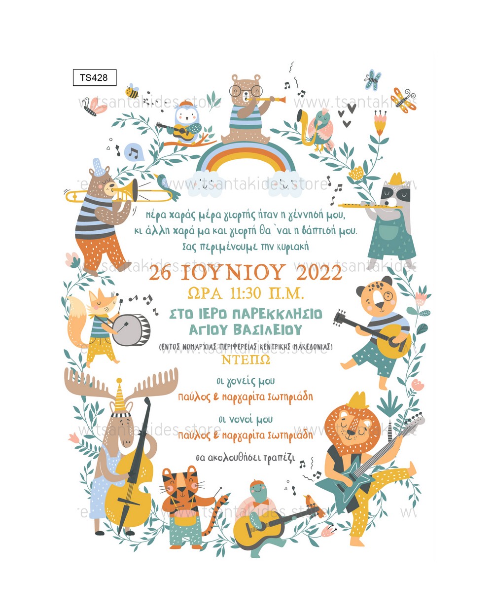 Προσκλητήριο βάπτισης για αγόρι με θέμα Musical Animals.