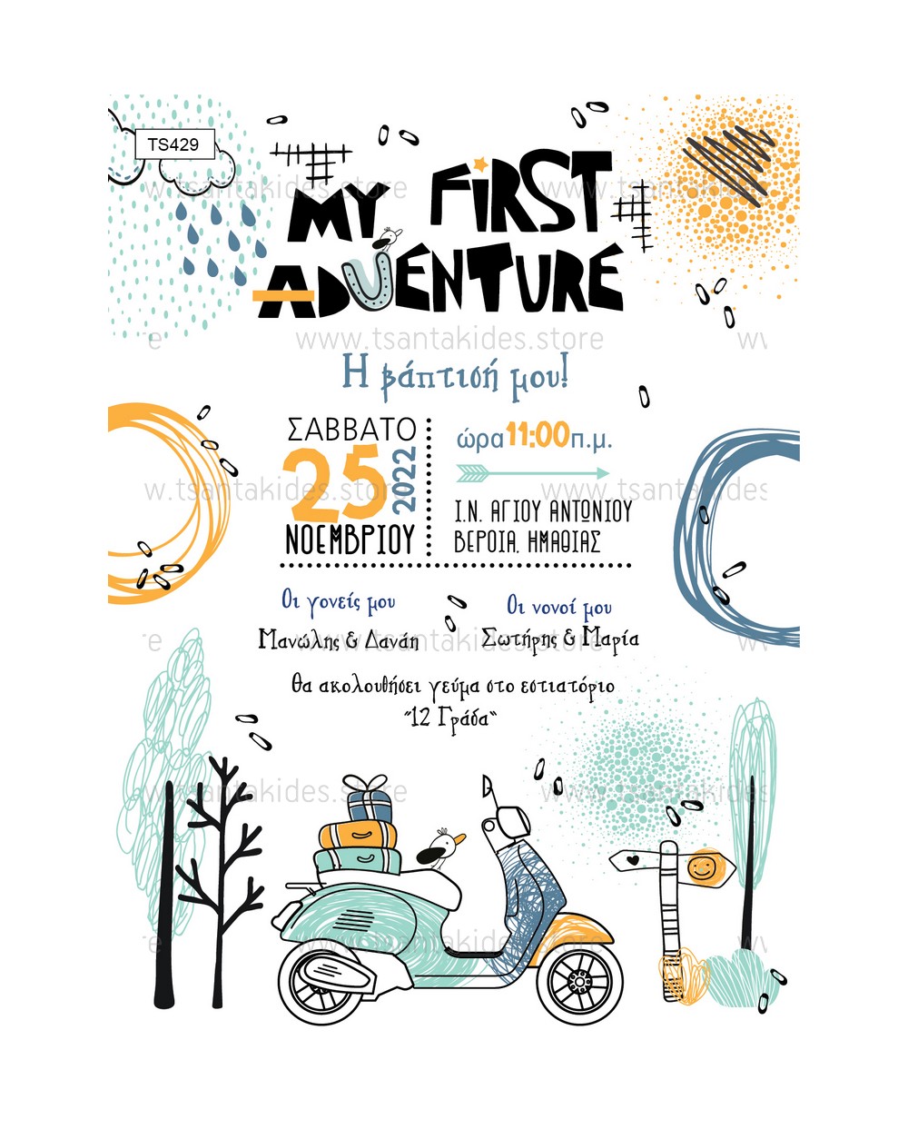 Προσκλητήριο βάπτισης για αγόρι με θέμα Vespa Travel.