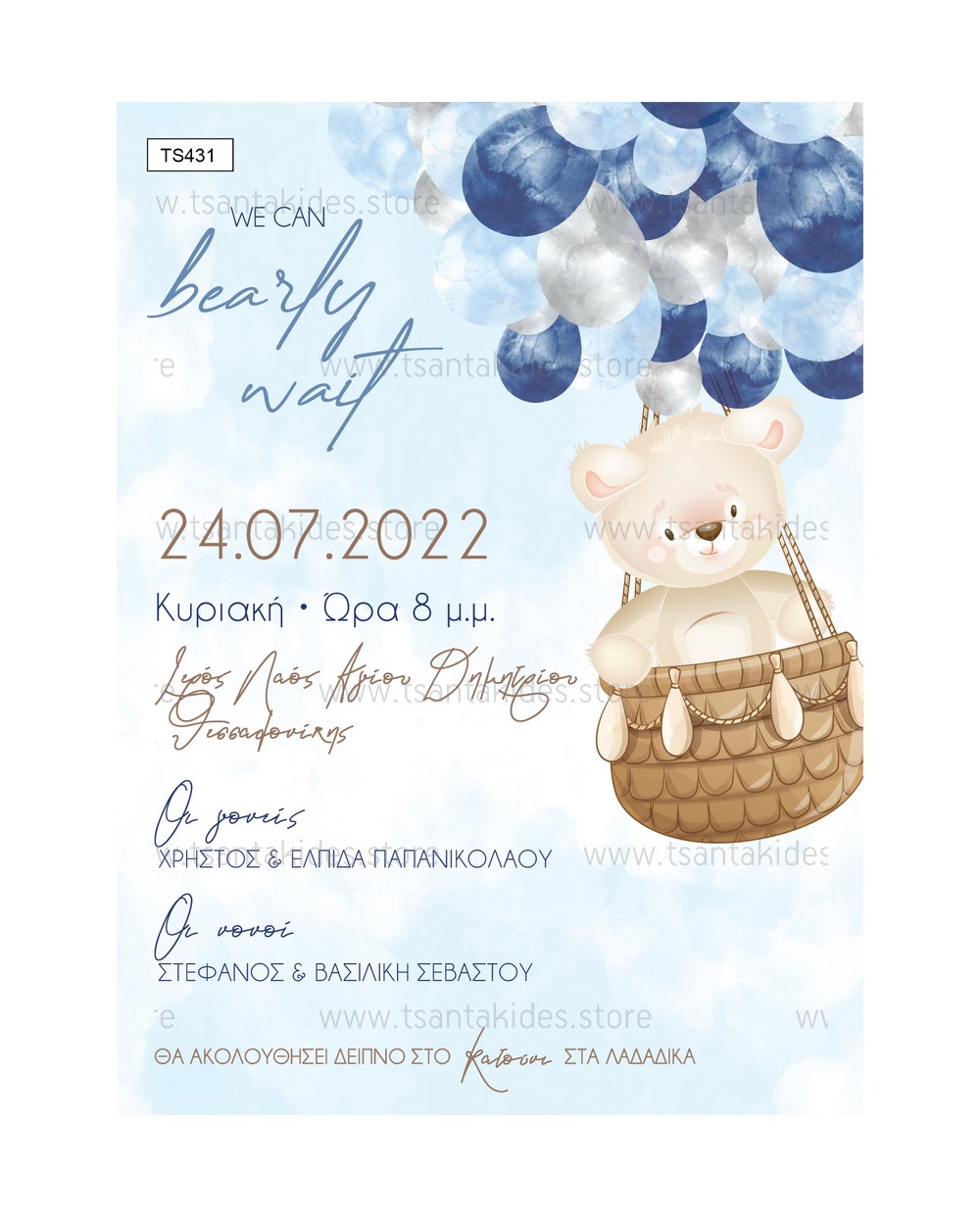 Προσκλητήριο βάπτισης για αγόρι με θέμα Bear Balloons.