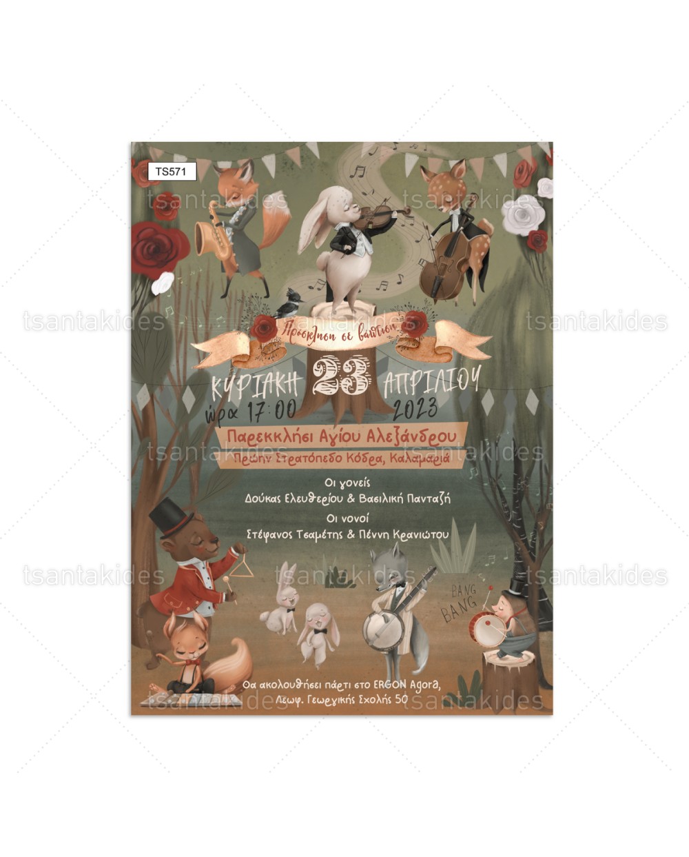 (TS571) Προσκλητήριο Βάπτισης Ζωάκια Μουσικοί