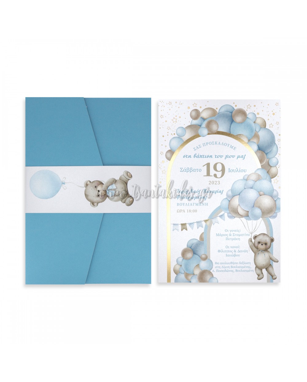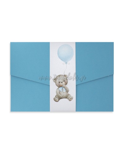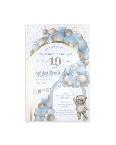 (1867 No103K) Προσκλητήριο Αρκουδάκι με Μπαλόνια Γαλάζιο