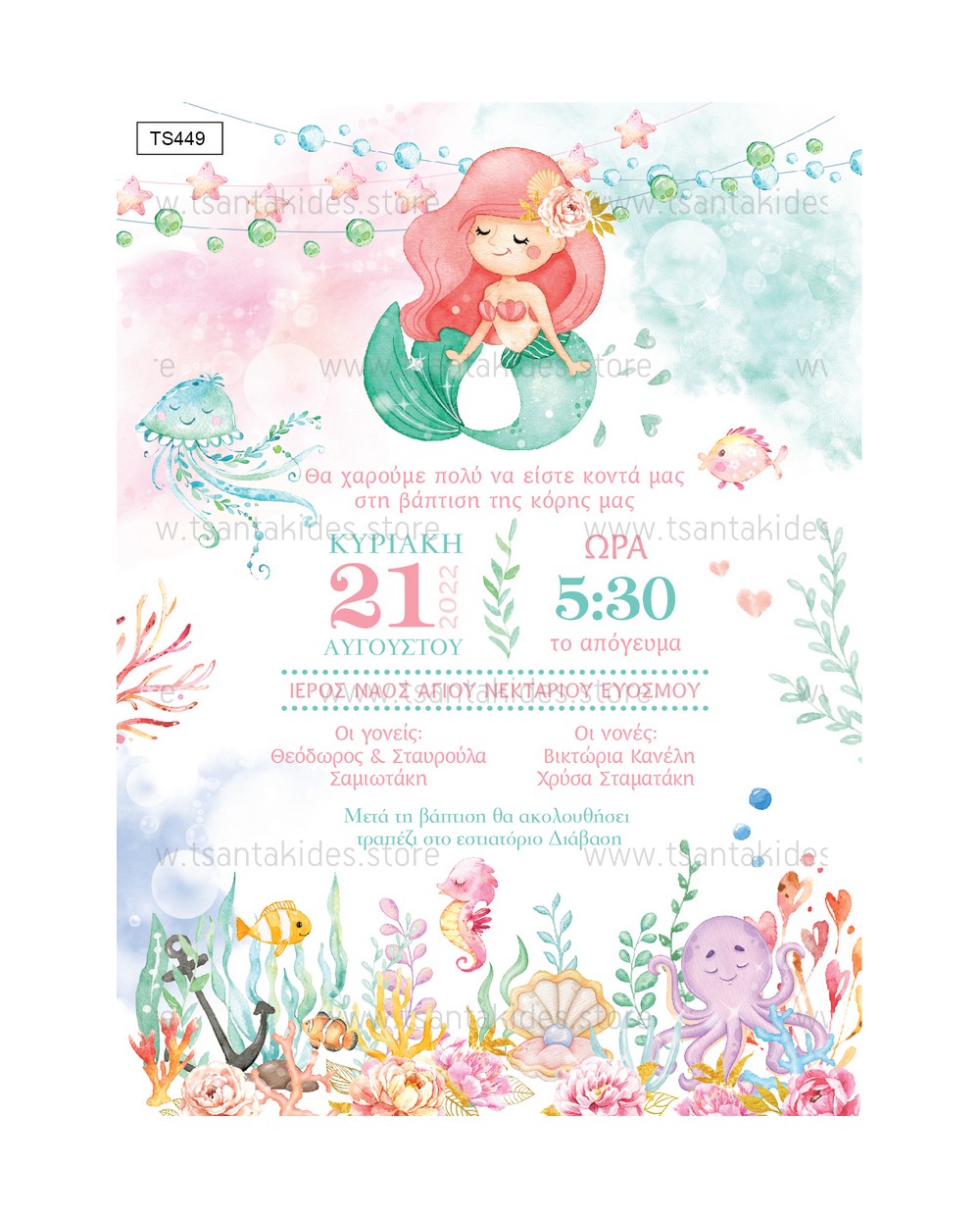 Προσκλητήριο βάπτισης για κορίτσι με θέμα Mermaid.