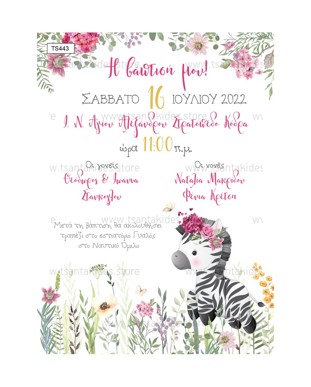 Προσκλητήριο βάπτισης για κορίτσι με θέμα Cute Zebra.