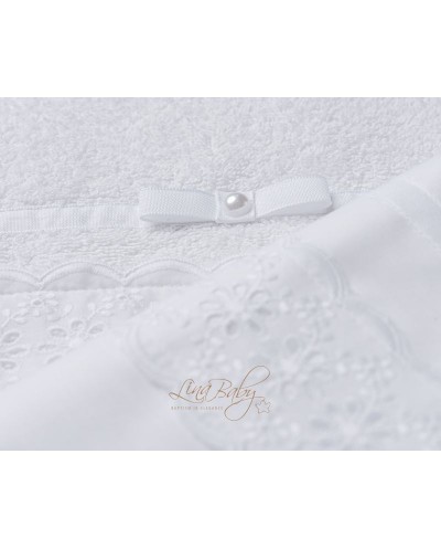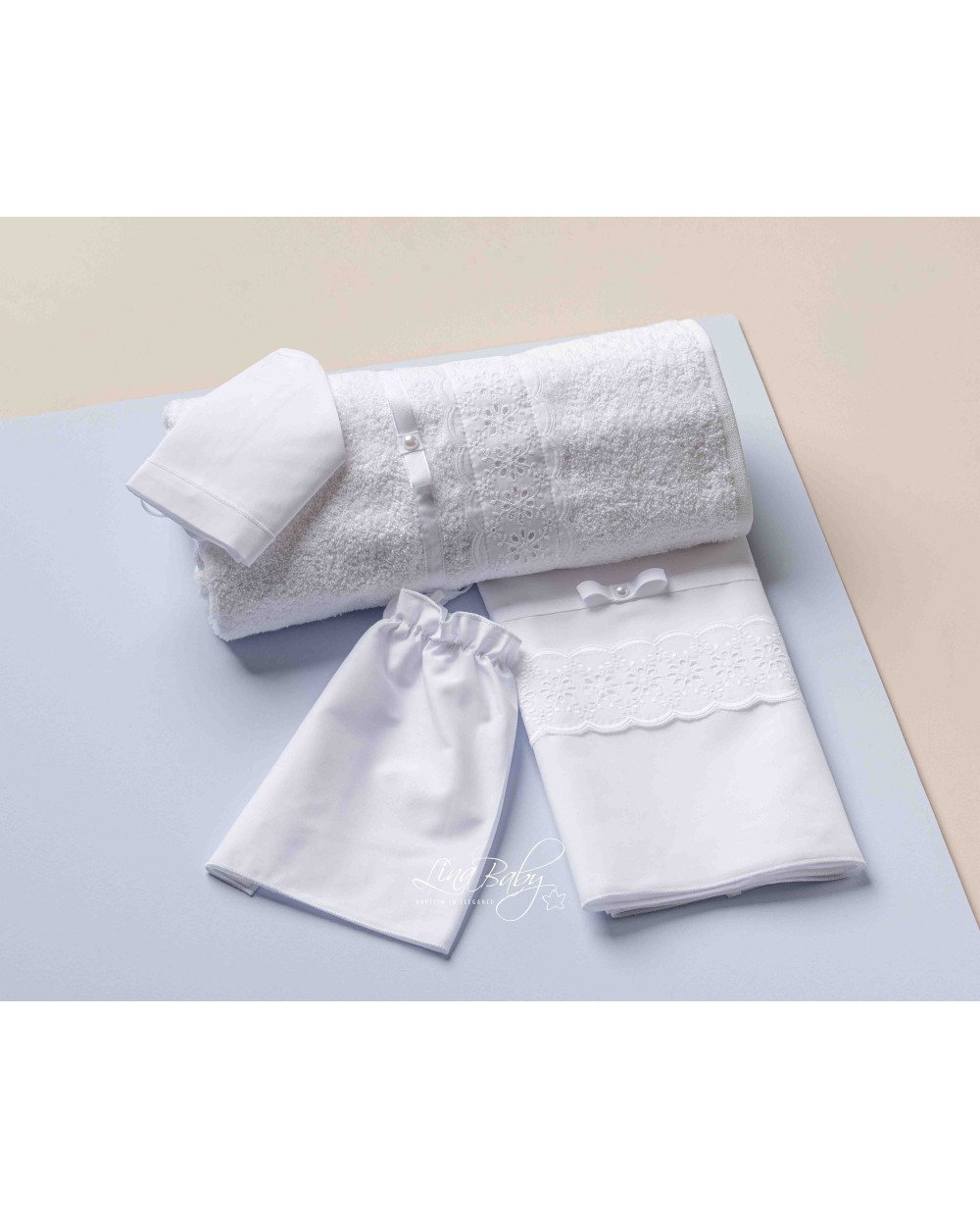 Υπέρκομψο βαμβακερό σετ λαδόπανων σε Λευκό χρώμα, με Broderie Anglais Εntredeux τρέσα και βαμβακερή κορδέλα με φιογκάκι και πέρλα.
