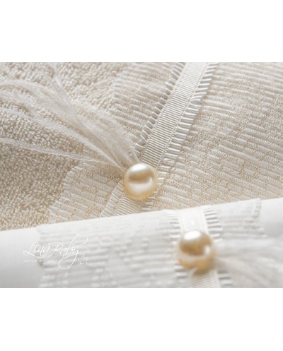 Ρομαντικό αλλά και τόσο κομψό βαμβακερό σετ λαδόπανων σε ιβουάρ χρώμα με μοναδική πλισέ δαντέλα Chantilly, σατέν κορδέλα, πέρλα και φτερό.